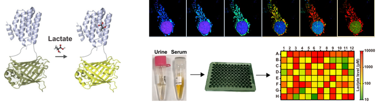 LightOn或LightOff系统可使人们以前所未有的精度来控制动物、细菌、真菌等物种细胞内基因的表达,不仅可以广泛应用于生命科学领域研究,还将为糖尿病等人类疾病提供一种在时间和剂量上精确控制的基因治疗新途径。图片显示了利用光控制基因表达,将一幅图片“印刷”在单层哺乳动物细胞上,或者控制糖尿病小鼠的血糖稳态。(Nature Methods, 2012, 9, 266;Cell Research 2016, 26, 854; Nucleic Acids Res 2016, 44,6, 2677 ; ACS Synth Biol. 2018, 7, 2045;Nucleic Acids Res 2020, 48, e33;Nature Communications 2021, 12, 615;ACS Synth Biol 2023, 12, 664) --------------------------------------------------------------------------------------------------------------------------------------------------- Frex, the Sensor for Cellular Metabolism