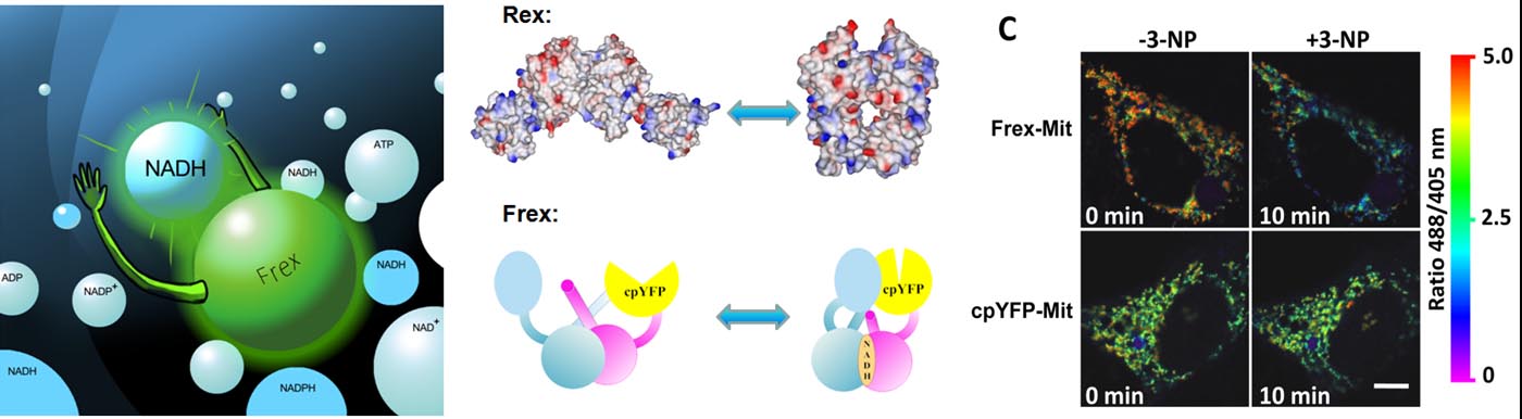 Frex 系列遗传编码荧光探针实现了在活细胞各亚细胞结构中对细胞代谢的动态检测与成像,是研究癌症及代谢类疾病及药物筛选的有力工具。 图片显示了对线粒体抑制剂对细胞内线粒体中NADH代谢的影响。(Cell Metabolism, 2011, 14, 555) -------------------------------------------------------------------------------------------------------------------------------------------------------- In vivo Imaging of Cell Metabolism Using SoNar