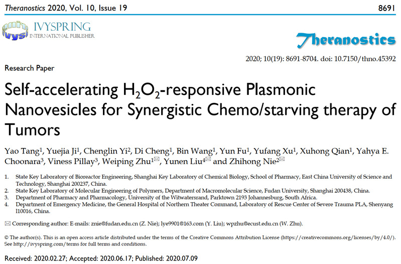 最近,best365英国体育在线best365英国体育在线朱维平教授创新发展了一种自加速过氧化氢刺激响应型金纳米囊泡,实现了对小鼠肿瘤化疗和饥饿治疗的协同治疗,相关成果以“Self-accelerating H2O2-responsive plasmonic nanovesicles for synergistic chemo/starving therapy of tumors”为题,发表在生物医学杂志《Theranostics》上(Theranostics, 2020, 10 (19): 8691-8704)。