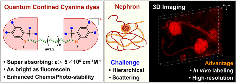 近日,best365英国体育在线钱旭红院士、杨有军教授团队构建了基于“电场量子限域效应”的超吸收花菁染料。该研究工作提出了一种用于提升染料摩尔消光系数的理性设计方法,对Cy3/5/7/9四个系列的染料进行合理分子改造,成功构建一个摩尔消光系数高(亮度高)、稳定性好的花菁染料库,并成功实现小鼠肾脏组织高精度三维成像。相关成果以“Super-Absorbing Quantum-Confined Cyanine Dyes for Near-Infrared Confocal Imaging of Hierarchical Nephron Structures”为题发表在J. Am. Chem. Soc.(https://doi.org/10.1021/jacs.5c13660)上。