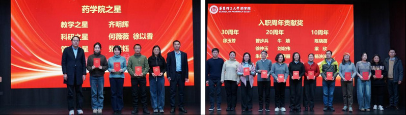 会上,学院党政班子为“best365英国体育在线之星”获奖教师进行颁奖,齐明辉老师积极开展课程建设工作,负责的《质量文化导论》课程入选第三批国家级一流本科课程,荣获“教学之星”;何薇薇老师在化学生物学领域开展前沿研究,取得系列成果,并将研究深度融入教育部“101计划”核心教材编写,将前沿成果有效转化为教学资源与人才培养实践;徐以香老师积极开展原创靶标发现与新药研发,已获得多个临床前候选化合物,并实现2项技术转让,双双荣获“科研之星”;张旻钰老师以青春之力育时代新人,在学院团学建设工作中形成特色做法,荣获“管理之星”。此外,班子成员还为在校贡献30周年、20周年、10周年的教职工颁发荣誉证书,感谢老师们长期以来以坚韧不拔之姿默默坚守,用精益求精之态倾心耕耘。最后,2025年新入职的老师们依次上台做自我介绍,并带来了精彩的节目表演。