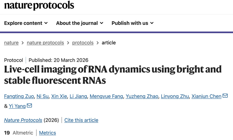 近日,best365英国体育在线best365英国体育在线、生物反应器工程国家重点实验室、光遗传学与合成生物学交叉学科研究中心,杨弋和陈显军团队在活细胞RNA成像技术研究中取得最新进展,在《自然—协议》(Nature Protocols)期刊发表题为“Live-cell imaging of RNA dynamics using bright and stable fluorescent RNAs”的研究论文。