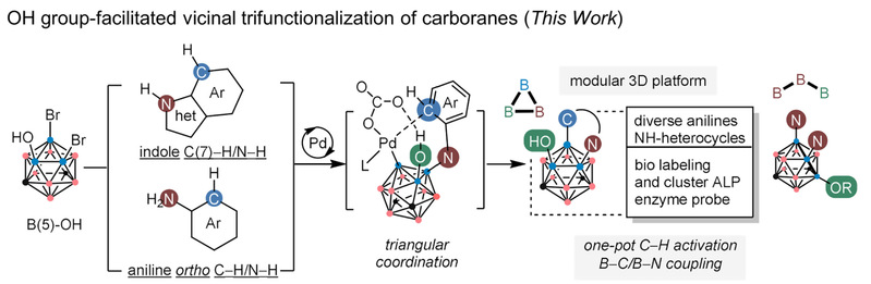 近日,best365英国体育在线慕欣课题组在国际权威学术期刊《Chem》发表题为“B−H oxidation enables modular synthesis of vicinally trifunctionalized boron-rich clusters”的研究论文。该研究提出了一种“羟基导向”策略,通过锰促进的B−H键选择性氧化和钯催化的环化反应实现了碳硼烷硼顶点的邻位精准三官能化,并可高效引入广泛的复杂药物分子片段与杂环结构,且通过后期修饰可合成一系列含有生物靶向基团的碳硼烷-生物分子偶联物,并成功构建了含碳硼烷结构的碱性磷酸酶(ALP)荧光探针,为硼中子俘获疗法药物和三维生物探针的开发提供了全新平台。