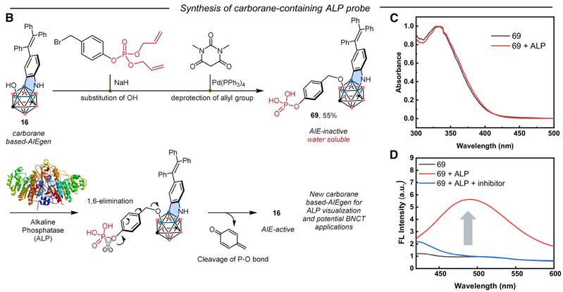 为了攻克上述难点,研究团队从9,10-二溴-间位碳硼烷出发,通过精确计算B−H键解离能,利用锰促进的氧化反应在能量最低的B(5)位点引入羟基,成功构建出独特的“溴-溴-羟基”三角结构区。在此基础上,引入钯催化的偶联反应体系。研究发现,引入的羟基发挥了关键的“配位导向”作用:在首步B−N偶联后,羟基与碳酸根碱基配位并连接至钯中心形成螯合环。这一过程有效抑制了双B−N偶联副反应的发生,促进了芳基C−H键活化和后续B−C键偶联,从而推动芳胺或吲哚类化合物顺利完成环化,实现了碳硼烷笼与稠环结构的完美融合。该方法展现出优异的底物兼容性和官能团耐受性。无论是含不同电子效应的芳胺,还是多环、杂环底物,均能高效参与反应。同时,该策略可以将复杂药物分子片段(如抗凝血药达比加群酯前体、抗癌药卡博替尼衍生物、天然产物鬼臼毒素类似物)高效引入碳硼烷骨架。 此外,引入的羟基进一步拓展了该三维骨架后期修饰能力。团队成功将其与整合素抑制剂多肽c及PSMA靶向配体GUL偶联,高效制备出一系列碳硼烷-生物分子偶联物,展现出广阔的药物化学应用前景。在此基础之上,为了进一步向临床应用特别是俘获疗法方向迈进,研究团队设计并构建了靶向ALP的荧光探针。ALP的异常升高与肝癌、前列腺癌及骨癌等多种疾病密切相关,是重要的癌症生物标志物。 团队通过将环化产物的羟基修饰为磷酸基团,获得了水溶性良好且背景无荧光的前体分子。在ALP的特异性酶解作用下,磷酸基团被脱除,羟基得以恢复,激活聚集诱导发光(AIE)效应从而释放出荧光信号。